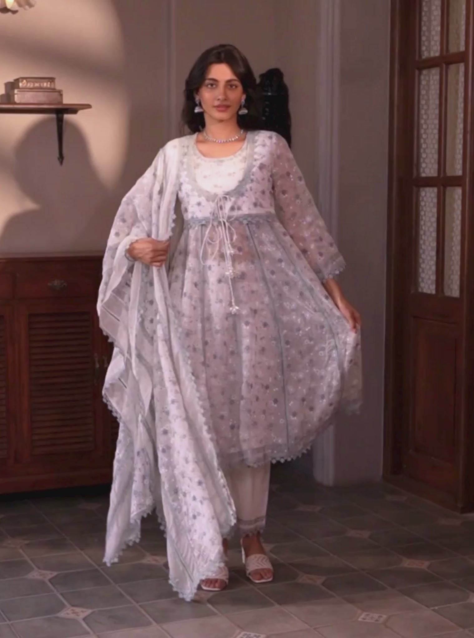 Step into a summer fairy tale with this dreamy white organza Anarkali set. The delicate organza fabric is adorned with intricate floral embroidery, creating a whimsical and ethereal look. The jacket-style Anarkali features a tie-up detail in the front, accentuated by lacework, that is mirrored on the sleeves and the hemline.