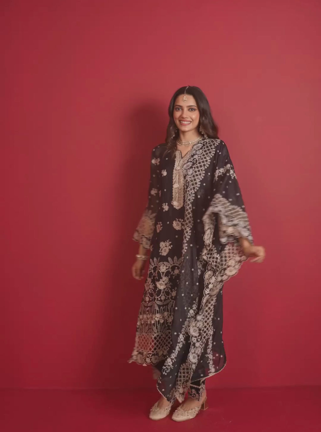 Sheer Elegance. This Black Kurta Set In Organza Is Balanced With Pima Satin Pants And A Tonal Organza Dupatta. A Modern Take On Festive Wear In A Classic Shade.