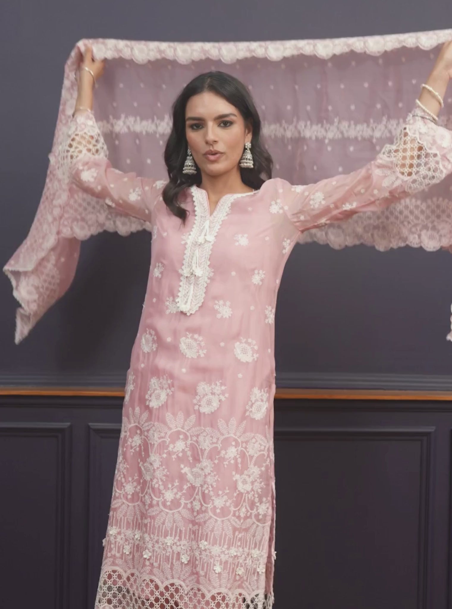 Soft Onion Pink Meets The Delicacy Of Organza In This Kurta Set. Paired With Satin Pants And A Matching Dupatta, It’S A Pastel Dream For Understated Celebrations.