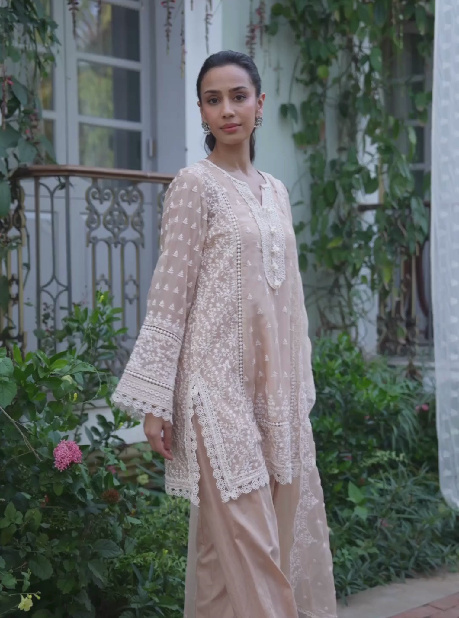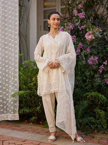 Crafted in lightweight organza, the Meyo Kurta Set features a straight kurta detailed with delicate embroidery and refined borders. The kurta is paired with comfortable KLF satin pants that add structure while maintaining fluid movement. A coordinated organza dupatta completes the ensemble with a soft, airy drape.