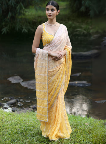 A Vision In Pastel, This Exquisite Ombre Pink Saree Is A Poetic Blend Of Grace And Artistry. Delicately Adorned With Intricate Embroidery And Shimmering Accents, It Captures The Essence Of Timeless Femininity. The Saree Features Subtle Diagonal Embellishments That Add A Touch Of Understated Opulence, While The Scalloped Border Lends A Romantic Charm. The Fabric Drapes Effortlessly, Creating A Fluid Silhouette That Exudes Sophistication.
