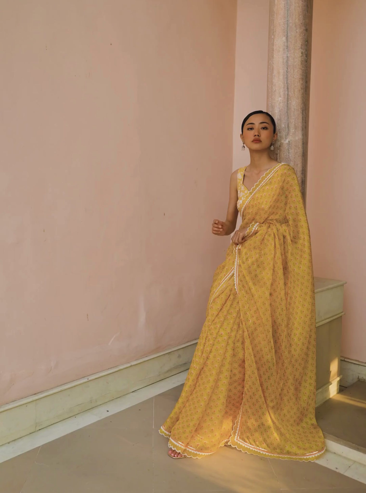 The Clarimond Saree In Yellow Is Crafted In Sheer Organza With Dainty All-Over Booti Prints. It’S Finished With A Contrast Piping And A Delicate Scalloped Border, Accented With Lumpy Gota For A Touch Of Glint. The Saree Is Paired With An Unstitched Blouse Piece Featuring A Bold Gadh-Inspired Print.