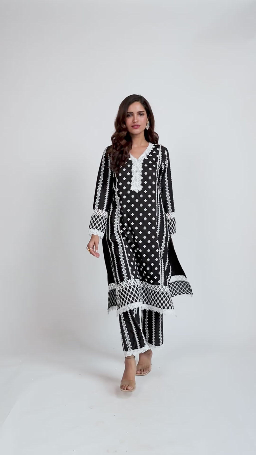 - The Look Is Supported By A Wide-Legged Palazzo, Adorned With A Laced Border And Vertical Zigzag Embroidery Running On It.
