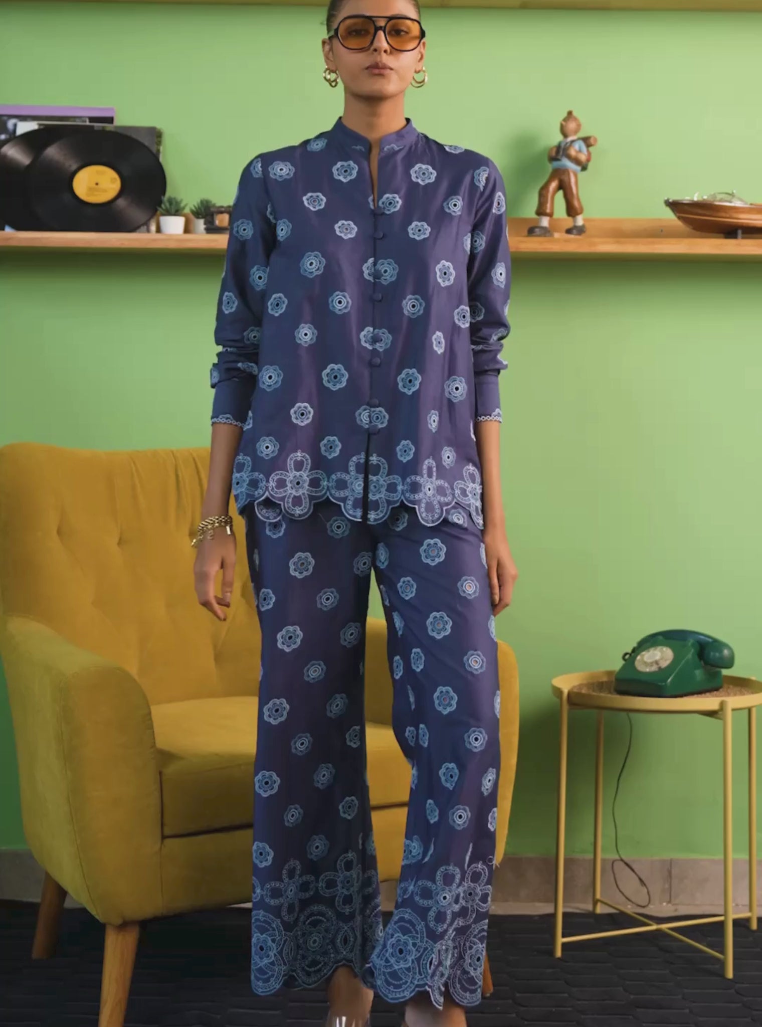 A coordinated shirt-and-pant set in fluid pima satin with a soft sheen. The Zivi silhouette is relaxed yet structured, designed for comfort during long celebrations while looking refined.