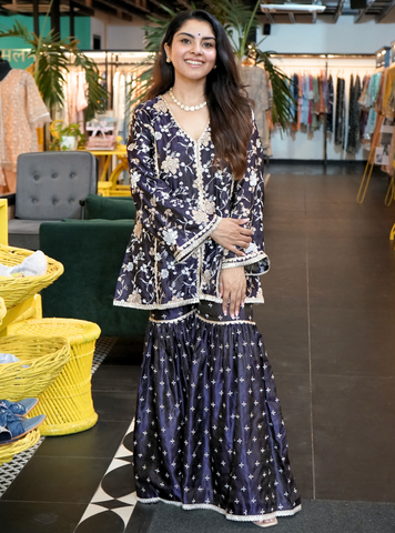 This Stunning Co-Ord Set Is A Perfect Fusion Of Tradition And Contemporary Chic. The Deep Purple Hue Serves As A Rich Canvas For Intricate Floral Embroidery. The V-Neckline Top With Three-Quarter Sleeves Is Gracefully Paired With Flared Pants Adorned With Embroidery, Making It A Standout Choice For A Sangeet Or An Evening Wedding. The Asymmetrical Hemline Of The Top And The Flowy, Voluminous Silhouette Of The Pants Create A Balanced Look Thats Both Modern And Timeless. Ideal For Those Who Want To Make A Statement, This Ensemble Effortlessly Blends Comfort With Style, Ensuring You Shine At Any Festive Event.